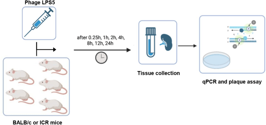 Following this, phage concentrations were measured in whole blood, liver, and spleen homogenates using plaque assays and qPCR techniques.