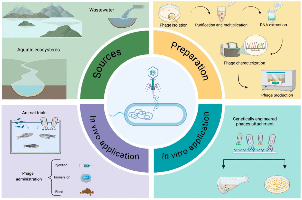 The isolation, identification, whole genome sequencing, and genomic analysis of bacteriophages are essential for obtaining detailed information about the phages and establishing phage libraries. These libraries are necessary for preparing effective phage cocktails specifically tailored to pathogens identified by local farmers in a target region. The major challenge in aquaculture is ensuring the efficient delivery of phages to the infection site and addressing potential immune-mediated phage clearance.