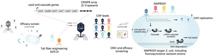 “The SNIPR001 combines four engineered phages (CAPs – CRISPR-CAS armed phages) that specifically target fluoroquinolone-resistant Escherichia coli in the gut microbiome. This precision approach was developed after screening wild-type phages against phylogenetically diverse Escherichia coli strains, followed by sophisticated engineering that incorporates both tail fiber modifications and CRISPR-CAS machinery to enhance targeting specificity and reduce resistance development, while preserving beneficial gut microbiota.”